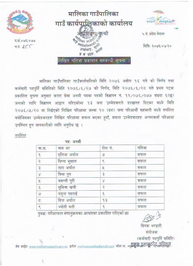 अनमी पदको लिखित नतिजा प्रकाशन सम्वन्धी सूचना ।