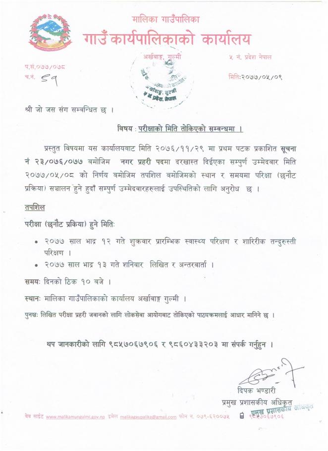 नगर प्रहरी पदको परिक्षा सञ्चालन हुने सम्वन्धि सूचना ।