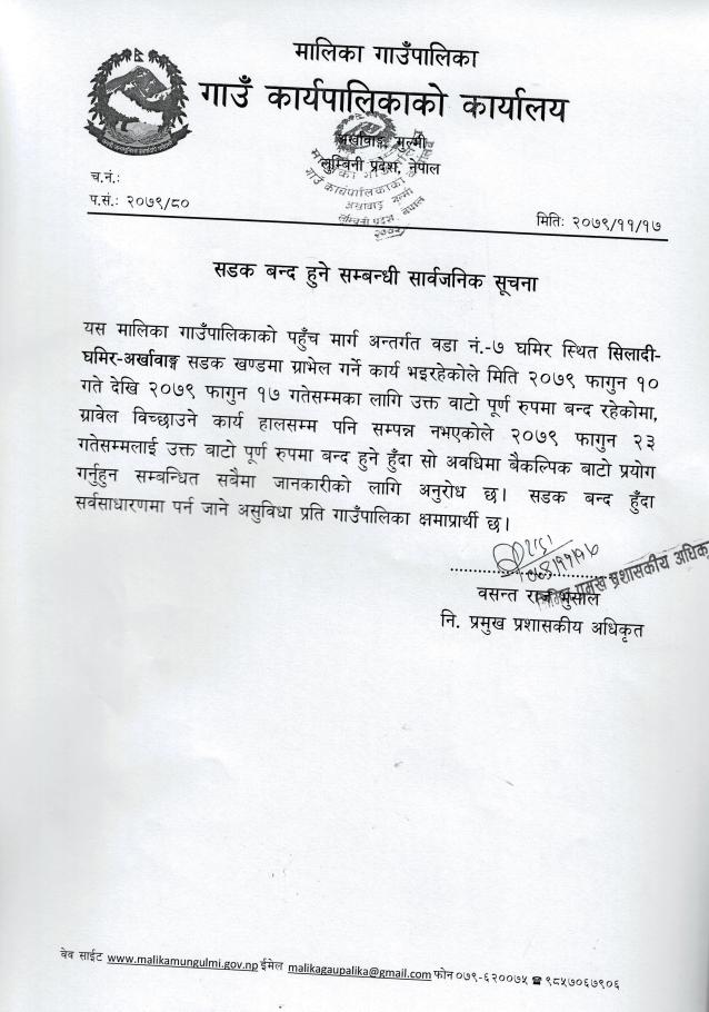 मालिका गाउँपालिकाले सूचना थप प्रभावकारी बनाउने उद्देश्यले अडियो नोटिस सेवा सुचारु गरिएको छ। सूचना प्राप्त गर्न १६१८०७९६२००७५ मा डायल गर्नुहोला ।