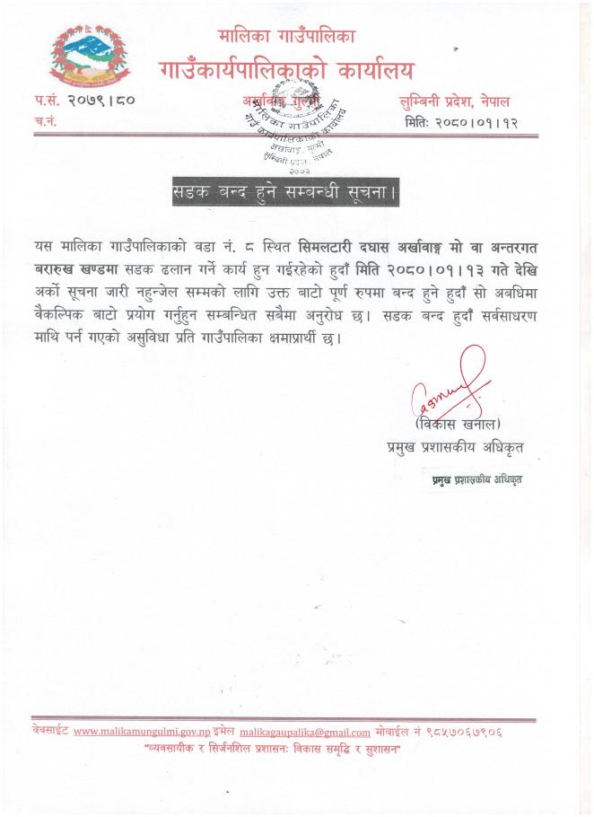 सिमलटारी दघास अर्खावाङ्ग सडक बन्द हुने सम्बन्धी सूचना।